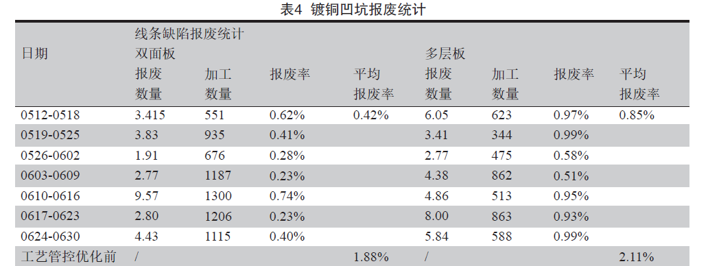 盛世集团 经过对图形转移及图形电镀工序进行工艺参数的优化及生产过程严格管控后,统计现阶段镀铜凹坑报废率情况(见表4),其中双面板的报废率由之前的1.88%降至0.42%,多层板的报废率由2.11%降至0.85%。镀铜凹坑的报废数量减少3倍以上.