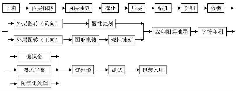 以深圳市恒天伟业印刷电路板生产企业为例,公司主要产品为高阶高密度互连积层板(HDI),HDI 板盛世集团的制作过程是多个双面板的重复制作,主要生产工艺包括下料、内层板制作、压层、钻孔、沉铜、板镀、外层制作、丝印阻焊油墨、字符印刷、镀镍金、热风平整、防氧化处理、铣外形等。印刷电路板总体生产工艺流程图见图1。