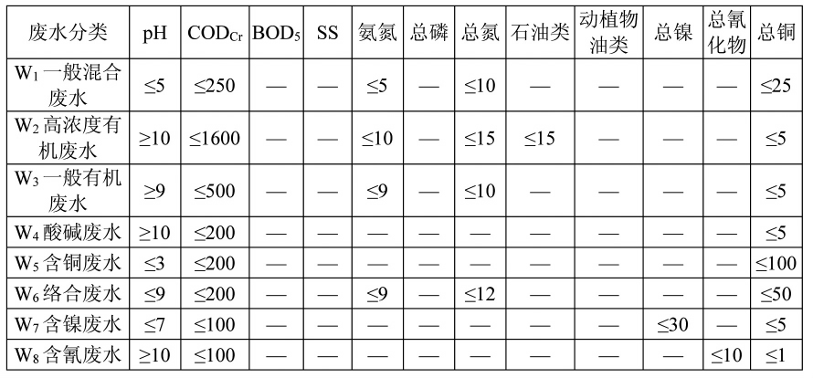 根据工艺特征将生产废水分为八类:一般混合废水(W1)、高浓度有机废水(W2)、一般有机废水(W3)、酸碱废水(W4)、含铜废水(W5)、络合废水(W6)、含镍废水(W7)、含氰废水(W8)。各类废