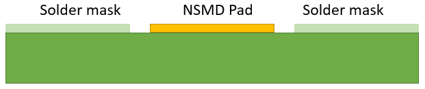 用于防止桥接的NSMD焊盘及其阻焊层凸版的侧视图。NSDM焊盘和阻焊层之间的间隙为多余的焊料提供了空间。
